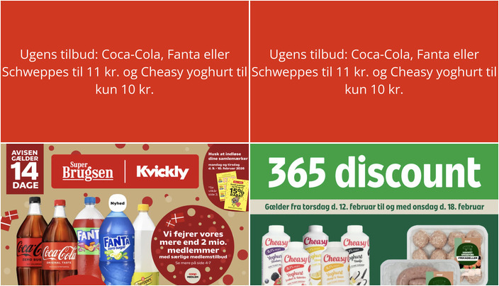 SuperBrugsen har et godt tilbud på Coca-Cola, Fanta eller Schweppes i flere varianter (125-150 cl) til kun 11 kr. pr. flaske. Tilbuddet gælder fra fredag d. 6. februar til og med torsdag d. 19. februar 2026.